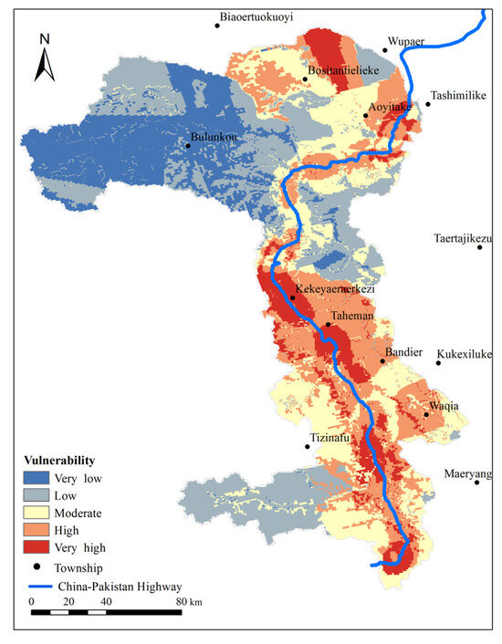 The vulnerability in the study area is generally concentrated in the township regions along the Kashgar-to-Khunjerab section of the China–Pakistan Highway. Very high vulnerability zones are mainly located in Kekeyaeraerkezi, Taheman, Tizinafu, and Dabudaer. High vulnerability zones involve eight townships, namely Aoyitake, Bulunkou, Kekeyaeraerkezi, Taheman, Dabudaer, Bandier, Waqia, and Yaoertuokuoyi. Medium vulnerability zones are mainly located in Yaoertuokuoyi, Bositantielieke, Aoyitake, Tizinafu, and Dabudaer. Low and very low vulnerability zones are mainly located in Bulunkou, Tizinafu, Wupaer, Aoyitake, and other areas in the north and southwest corner of the study area.