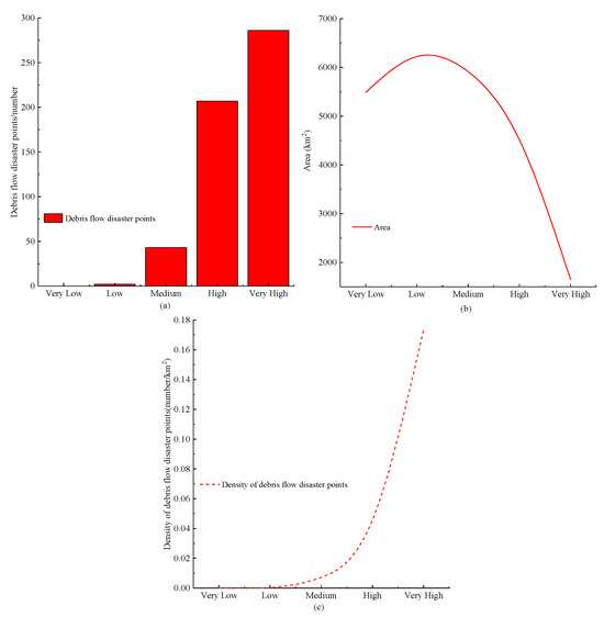 The variations in debris flow disaster points, areas and density of debris flow disaster points at different risk zones. (a) debris flow disaster points; (b) area; (c) density of debris flow disaster points.