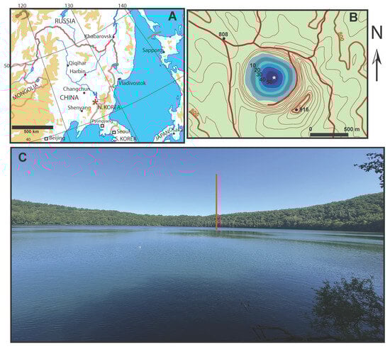 The study site, Sihailongwan Maar Lake, is located in the Long Gang volcanic field Jilin Province, in Northeast China (42°17′ N, 126°36′ E, 790 m a.s.l., Figure 1). This lake is a typical maar lake, i.e., a volcanic lake formed by a phreatomagmatic explosion. Its morphology is therefore shaped like a bowl, with steep rocky slopes and a flat bottom, a relatively small surface area (0.5 km2) but a deep water depth (maximum 50 m and relative depth of 6.3%). Detailed information on the geology, recent climate and vegetation of the region around the lake, as well as on the lake limnology, can be found in previous studies on this lake [14]. Lake Sihailongwan is a dimictic lake with two periods of circulation in the water column, in spring and in autumn. The winter ice-cover melts around mid-April, and the spring overturn, induced by wind mixing, is short-lived as the temperature of the surface waters rises quickly. Thermal stratification develops by the end of April, and the surface water reaches its maximum temperature of 25 °C in August. Afterwards, a cooling period starts, and the thermocline deepens. The autumn overturn period occurs in mid-November before the return of the ice-cover [15].