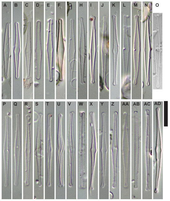Description: LM (Figure 2): Frustules in girdle view rectangular, solitary or, occasionally, two cells connected to each other (Figure 2V). Valves spindle-shaped to elongated, narrowly lanceolate with clearly convex, never-parallel margins, tapering from a broadened central area towards protracted, distinctly capitate apices, often deflected. Teratological forms with irregularly undulating or bent valve outlines often observed (Figure 2B,T). Valve dimensions: length 15–44 µm (n = 1078, LM and SEM), width 2.0–3.5 µm (from SEM images only, n = 36). Sternum distinct but narrow, gradually widening towards the central area. Central area swollen, forming small, irregularly shaped hyaline zone, occasionally absent. Striae alternating, parallel throughout entire valve, 21–25 in 10 µm. Areolae sometimes discernible in LM under differential interference contrast.