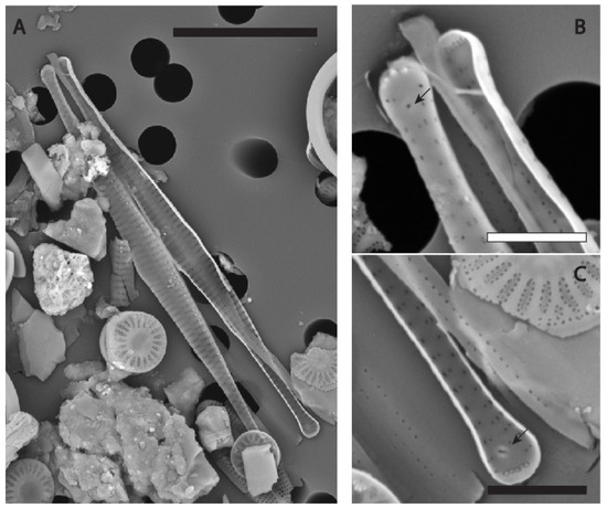 (A–C) SEM micrographs of Fragilaria longwania sp. nov. from Lake Sihailongwan, sediment trap sample collected in July 2009. (A) Whole view of two valves from the same frustule. (B) Detail from A showing, on the right, the external view of an apex, with opening of the rimoportula (black arrow) and three short spines located above the apical pore field; on the left, the internal view of the apex of the other valve without rimoportula. (C) Detail from A showing the internal opening of a rimoportula (black arrow) and the apical pore field. The girdle bands on the left and the right of the valve are ornamented by one row of poroids. Scale bars = 10 µm for (A); =2 µm for (B,C).