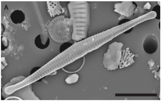 Finally, the apparently cosmopolitan Fragilaria tenera var. nanana (Lange-Bertalot) Lange-Bertalot et S.Ulrich partly overlaps with F. longwania in terms of valve dimensions as length and width of its valves range between 29 and 85 µm and 2.0–2.3 µm, respectively. However, the stria density of the variety nanana is lower (18.5–20 instead of 21–24 in 10 microns), as reported by Lange-Bertalot and Ulrich [34] and the outline of the valves, even for the short ones, is not spindle-shaped but lanceolate, with a barely inflated central area.