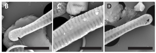 As discussed by Williams [28], the genus Fragilaria is currently aphyletic, i.e., without identified synapormophy, and so far, recent attempts to separate new genera from Fragilaria have not been entirely convincing [8,29,30]. Nevertheless, F. longwania shares many characters with what Williams [28] refers to as ‘classical’ species of Fragilaria, including the presence of one rimoportula on one apex, apical pore fields of the ocellulimbus type, uniseriate striae and open girdle bands. F. longwania is therefore best placed in that genus. Among the groups of Fragilaria species that Williams [28] recognized according to the occurrence and placement of their marginal spines, F. longwania is closest to the group 3, i.e., ‘classical’ species with spines that emerge from the vimines, even if some spines appear to emerge from virgae. In that group, Fragilaria tenera var. nanana and Fragilaria billingsi are included, two of the species that closely resemble F. longwania (see below).