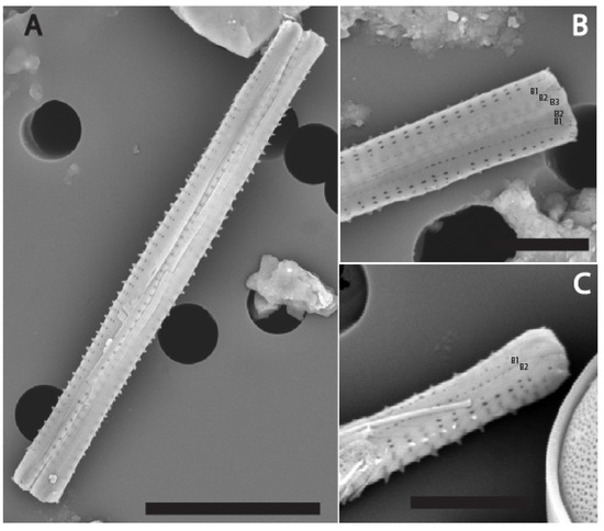 SEM (Figure 3, Figure 4, Figure 5, Figure 6, Figure 7 and Figure 8): Series of marginal spines, generally emerging from vimines, but sometimes from virgae, occurring more or less evenly from apex to apex (Figure 3C, Figure 5C, Figure 6C and Figure 7B). Spines acute, shaped like shark tooth (Figure 3B,C and Figure 8A). Up to three tiny spines present at apices (Figure 4B, Figure 5B and Figure 6B). Valve face flat with weakly raised virgae (Figure 3A, Figure 5C and Figure 7C). Central area with ghost striae (Figure 3D, Figure 5C, Figure 6C and Figure 7B). Striae uniseriate, composed of several (up to six) rounded areolae (Figure 5C, Figure 6C and Figure 7B), becoming transapically elongated on the mantle (Figure 8A,B), 62–74 in 10 µm (n = 35). Virgae much wider than the striae. Apical pore field of the ocellulimbus type, not well developed, composed of only one or two rows of small rounded poroids (Figure 3A,E, Figure 4B,C, Figure 5B,D and Figure 8B,C). One rimoportula is present per valve, positioned at a distal end (Figure 3A, Figure 4A, Figure 5A and Figure 7A). Externally, rimoportula opening small, rounded but not rimmed, generally located at the center of the last stria (Figure 3B, Figure 4B, Figure 5B, Figure 6B and Figure 7D). Internal rimoportula opening more or less elongated, oblique (Figure 4C). Girdle composed of only two or three open bands, ligulate, tapering and opening at the valve pole (Figure 8A–C). Each band with one row of poroids (Figure 4C and Figure 8A–C).