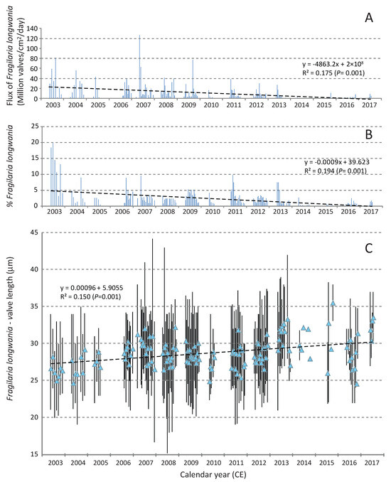 In Lake Sihailongwan, during the 15-year period of investigation, two centric diatoms, Discostella stelligeroides (Hustedt) Houk and Klee and Lindavia balatonis (Pantocsek) Nakov, Guillory, Julius, Theriot and Alverson, largely dominated the sediment trap assemblages. Fragilaria longwania was present in 139 of the 187 trap samples analyzed, with a maximum abundance of 19.8% recorded at the beginning of the study in June 2003 and a mean abundance of 2.1%. Over the study period, a general decline in flux and relative abundances is observed (Figure 9A,B). On the other hand, during the same period, the mean valve length follows a positive trend (Figure 9C).
