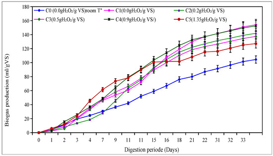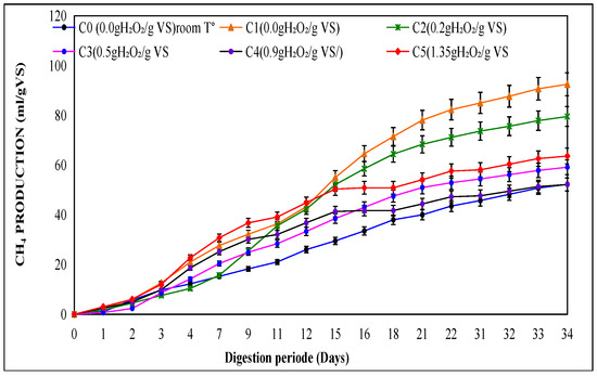 During the incubation period, the average percentage of methane in the produced biogas from different tests was 50%, 56%, 41%, 60%, 43%, and 50%, corresponding to C0 (0.0 g H2O2/g VS) room T°, C1 (0.0 g H2O2/g VS), C2 (0.2 g H2O2/g VS), C3 (0.5 g H2O2/g VS), C4 (0.9 g H2O2/g VS) and C5 (1.35 g H2O2/g VS), respectively.