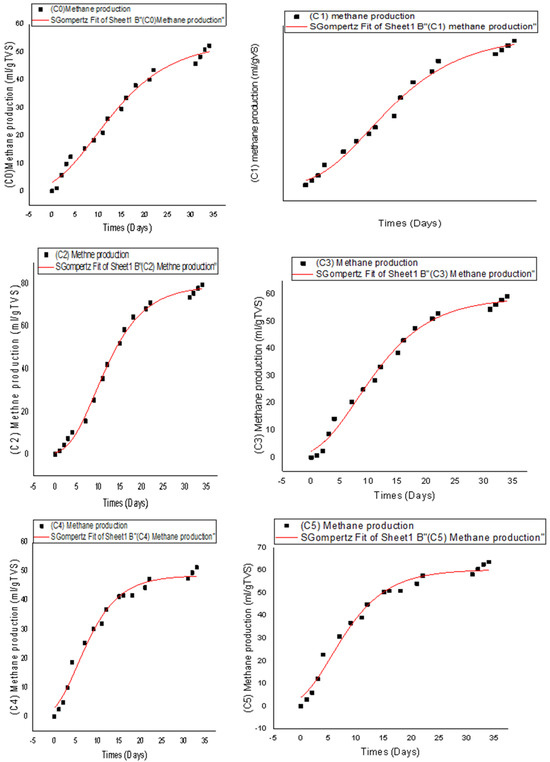 Fitting of the Gompertz model for cumulative methane production for all pretreatment tests.