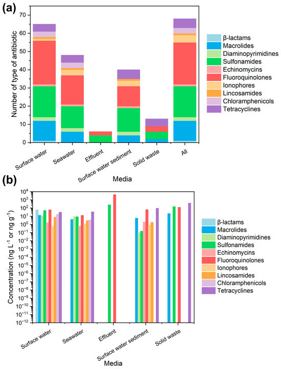 (a) Numbers of types of antibiotics and (b) weighted average concentrations of different major categories of antibiotics in different media.