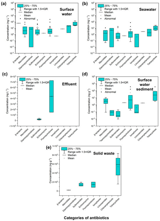 Distribution of different categories of antibiotics in different media. (a) surface water, (b) seawater, (c) effluent, (d) surface water sediment, and (e) solid waste.