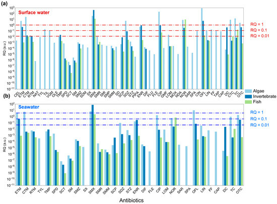 The average RQs of the antibiotics in the (a) surface water and (b) seawater.