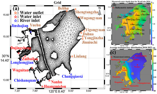 (a) Spatial relationship between drainage outlet, diversion inlet, river inputs and the model computational grid. (b) Field bathymetric stations in 2024, measured data, and interpolated depth data for hydrodynamic model. (c) Spatial distribution of average water transparency in West Lake from 2018 to 2022.