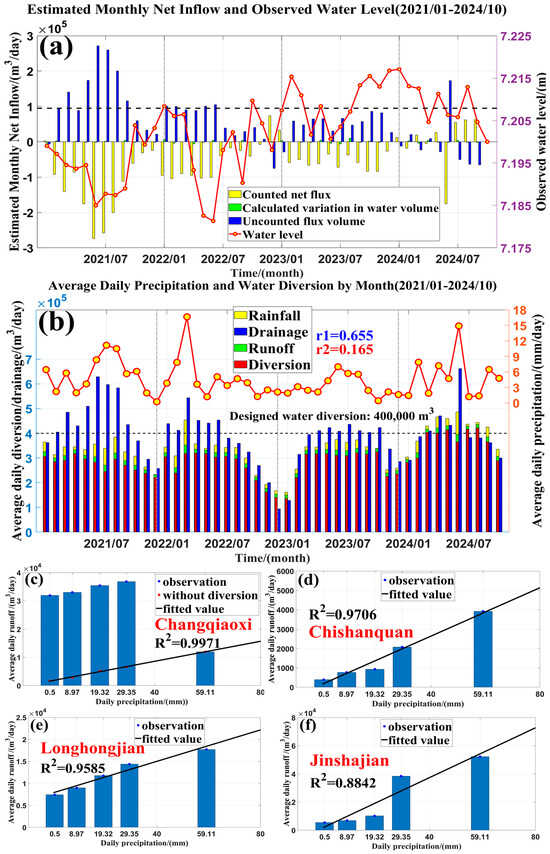 (a) Monthly averaged water level measurements, derived water storage changes, statistically quantified net flux, and calculated uncounted inflow contributions for West Lake (January 2021–October 2024). (b) Daily averaged flow data (January 2021–October 2024) for West Lake’s water diversion inputs, drainage outputs, precipitation inputs, and estimated major runoff inflows. (c–f) Average measured runoff across different precipitation ranges and precipitation-runoff linear regression results for West Lake’s four major influent rivers (Changqiaoxi, Chishanquan, Longhongjian, Jinshajian).
