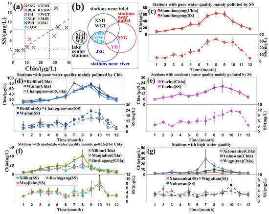 (a) The 3-year average concentrations of Chla (x-axis) and SSs (y-axis) at 11 water quality monitoring stations. (b) The classification of 11 monitoring stations based on their geographical relationship to inlet and outlet channels. (c) Monthly variations in Chla and SS concentrations at poor water quality stations where SSs serve as the primary pollutant: Shaoniangong. (d) Monthly variations in Chla and SS concentrations at poor water quality stations where Chla serves as the primary pollutant: Beilihu, Waihu, and Changqiaowan. (e) Monthly variations in Chla and SS concentrations at moderate water quality stations where SSs serve as the primary pollutant: Yuehu. (f) Monthly variations in Chla and SS concentrations at moderate water quality stations where Chla serves as the primary pollutant: Xilihu, Maojiabu, and Jinshagang. (g) Monthly variations in Chla and SS concentrations at high water quality stations: Xiaonanhu, Yuhuwan and Wuguitan.