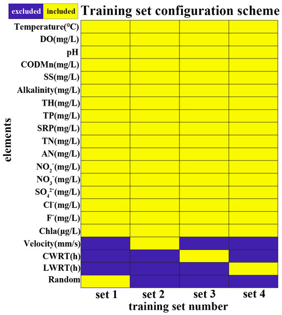 The composition of water quality (hydrodynamic) elements in the 4 training datasets (yellow: element included in the training set, blue: element excluded from the training set).