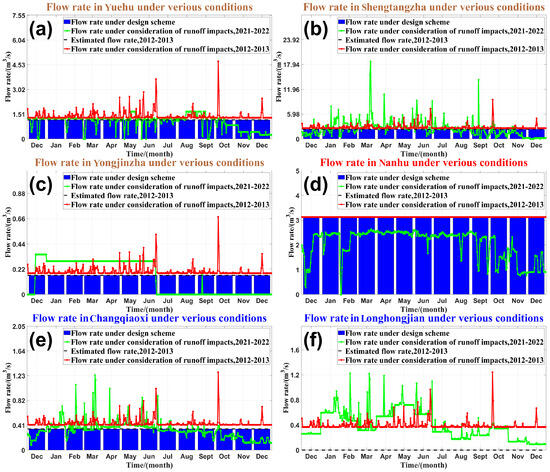 (a–c) Time series of drainage flow rates at 3 typical outlets under 3 different simulation conditions. (d) Time series of diversion flow rates at Nanhu inlet under 3 simulation conditions. (e,f) Time series of runoff inflow from 2 typical rivers under 3 simulation conditions, where condition 1 (black dashed line) excludes runoff contributions. The blue bars represent flow rates at all inlet/outlet under the design scheme.