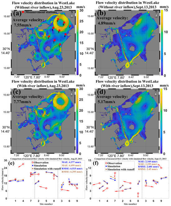 The distribution of simulated flow velocity/direction results and the location of flow velocity monitoring stations in West Lake on (a) Case 1, 23 August 2013; (b) Case 1, 13 September 2013; (c) Case 2, 23 August 2013; (d) Case 2, 13 September 2013. Comparison of observed versus simulated flow velocity at 9 monitoring stations on (e) 23 August 2013; (f) 13 September 2013.