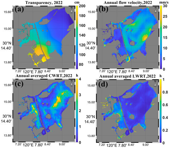 The spatial distributions of West Lake’s 2022 annual average (a) water transparency, (b) flow velocity, (c) CWRT, and (d) LWRT. In panels (c,d), both the CWRT and LWRT indices show a negative correlation with the water flux at the boundary of study regions. Lower values indicate higher water exchange rates in the corresponding regions. Yellow areas in the figure represent the lowest flow velocity, while blue areas indicate the highest velocity.