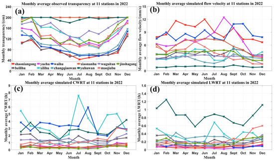 The monthly averaged data of (a) water transparency, (b) flow velocity, (c) CWRT, and (d) LWRT at 11 stations during 2022.