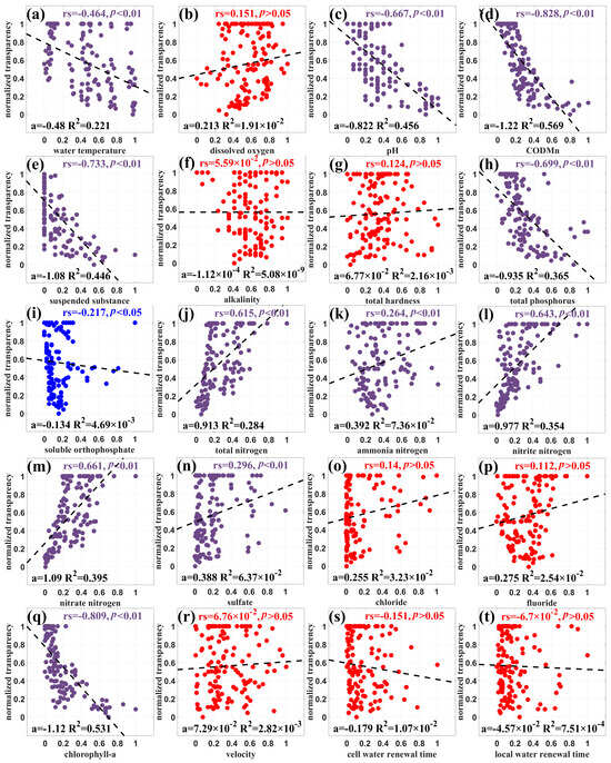 The Spearman correlation coefficients and linear fitting results between water transparency and (a) T, (b) DO, (c) pH, (d) CODMn, (e) SS, (f) alkalinity, (g) TH, (h) TP, (i) SRP, (j) TN, (k) AN, (l) NO2−, (m) NO3−, (n) SO42−, (o) Cl−, (p) F−, (q) Chla, (r) flow velocity, (s) CWRT, and (t) LWRT for all samples. The black dashed line represents the linear fitting result between the element on the x-axis and transparency. The purple scatter points and text indicate a Spearman’s test significance of p < 0.01, the blue scatter points and text indicate a Spearman’s test significance of p < 0.05, and the red scatter points and text indicate a Spearman’s test significance of p > 0.05.