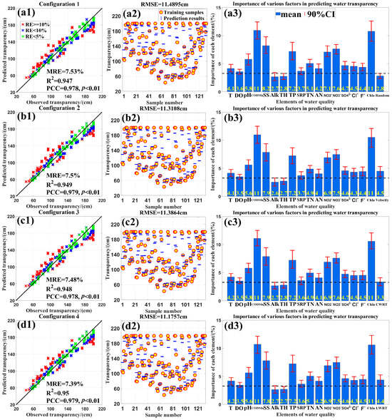 In comparison to the transparency predictions from the RF algorithm trained on configuration set 1 (excluding water exchange capacity information), where the MRE was 7.53% and the RMSE was 11.4895 cm, the other three configurations showed reduced prediction errors. Among them, set 4 (incorporating LWRT) performed best, achieving an MRE of 7.39% and an RMSE of 11.1757 cm. The mean feature importance of LWRT in set 4 was 4.38% (90%CI: (3.55%; 5.27%)), comparable to that of T (4.18%) and significantly higher than the randomized control variable in set 1 (90%CI: (2.33%; 3.27%)). Meanwhile, set 2 (incorporating flow velocity) and set 3 (incorporating CWRT) exhibited slightly higher errors (set 2: MRE = 7.5%, RMSE = 11.3108 cm; set 3: MRE = 7.48%, RMSE = 11.3864 cm) compared to set 4.
