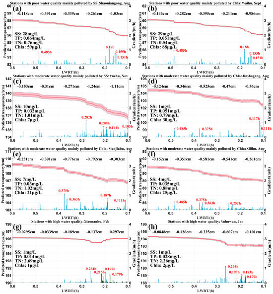 The variation in water transparency with decreasing LWRT at (a) Shaoniangong station under August water quality conditions. (b) Waihu station under September water quality conditions. (c) Yuehu station under November water quality conditions. (d) Jinshagang station under August water quality conditions. (e) Maojiabu station under August water quality conditions. (f) Xilihu station under August water quality conditions. (g) Xiaonanhu station under February water quality conditions. (h) Yuhuwan station under January water quality conditions. The black numbers above the curve represent the transparency change values for the corresponding intervals. The red numbers below the curve represent the LWRT values corresponding to the top 4 transparency change gradients.