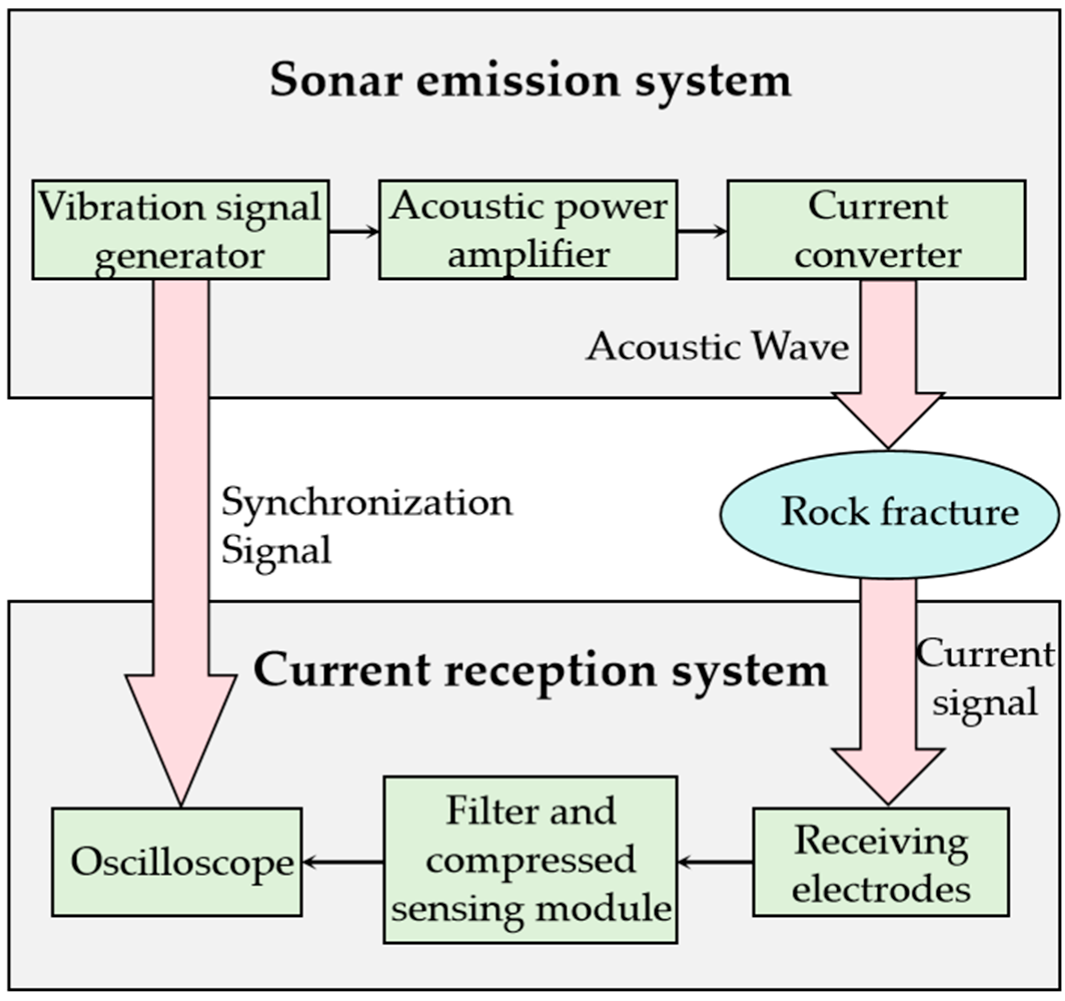 Figure 2) consists of a seismic source, a set of signal-receiving sensors, and a data acquisition unit. The receiving sensors include high-stability polarized electrodes and geophones, which detect both seismic and seismo-electric responses. In practice, seismic waves generated by the source propagate through the subsurface and interact with fluid-bearing fractures or porous layers. At these interfaces, electrokinetic coupling within the electrical double layer induces secondary seismo-electric fields. The returning signals thus contain two components: (i) elastic wave reflections that provide depth information on subsurface structures, and (ii) seismo-electric conversions that are sensitive to the presence and properties of pore fluids. Once transmitted back to the surface, these signals are captured by electrode pairs (