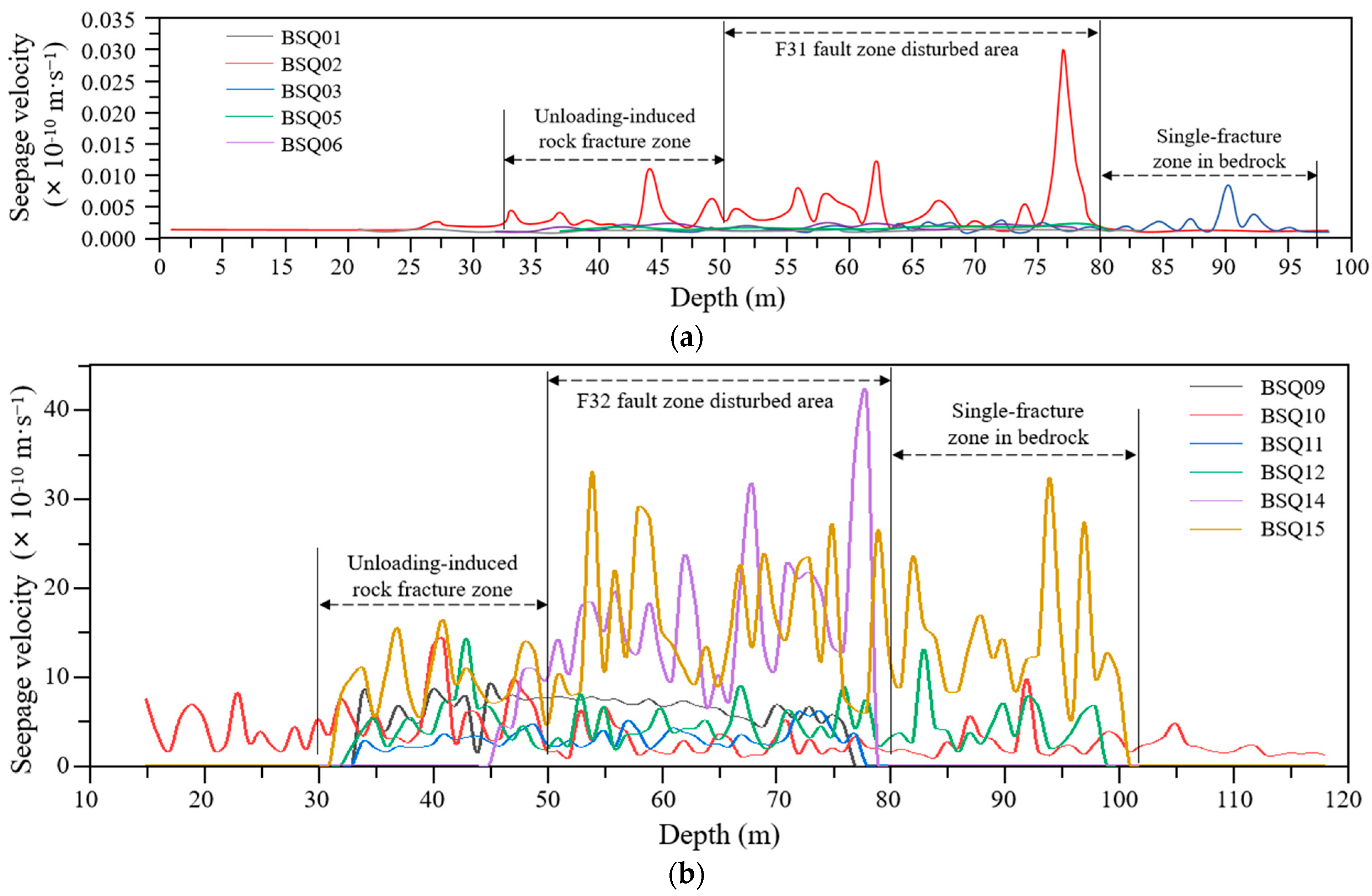 Seepage velocity curve and depth distribution curve of seismo-electric holes in Beishan area. (a) Distribution of seepage velocity curves from 3D seismo-electric measurements at boreholes BSQ01–BSQ06; (b) distribution of seepage velocity curves from 3D seismo-electric measurements at boreholes BSQ09–BSQ15; (c) cross-sectional flow rates at boreholes BSQ01–BSQ06 from 3D seismo-electric measurements; (d) cross-sectional flow rates at boreholes BSQ09–BSQ15 from 3D seismo-electric measurements.
