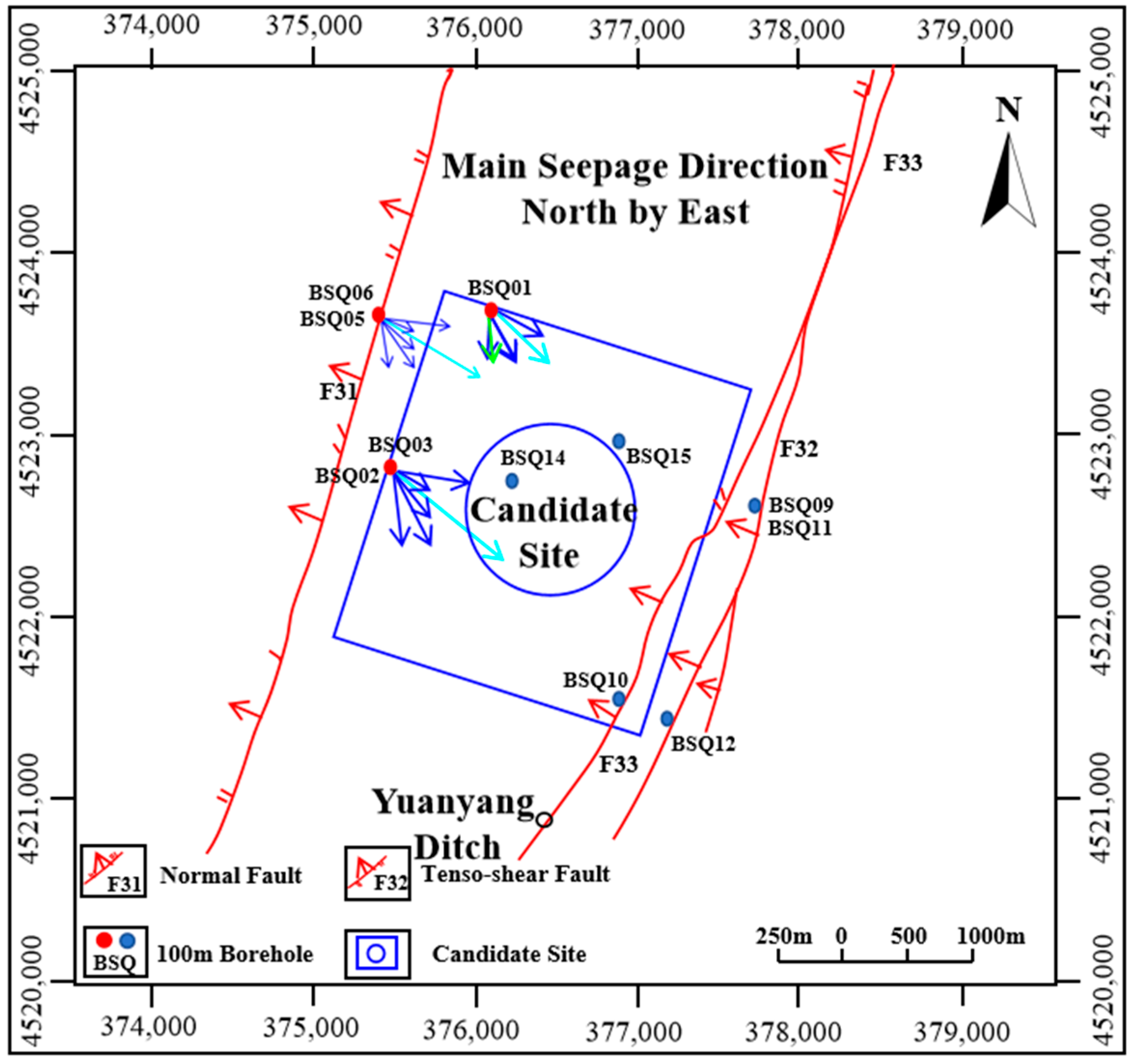 To investigate the groundwater seepage field characteristics within the study area, field measurements were conducted at two representative fault zones, Fault F31 in Xinchang and the Shiyuejing fault zone. Given the structural orientation of these faults and their potential control on groundwater flow pathways, five surface boreholes were deployed along Fault F31, and three boreholes were installed within a deep tunnel intersecting the Shiyuejing fault zone. This configuration enabled the acquisition of seepage field parameters across a range of depths, from surface to subsurface, to capture the spatial variability of groundwater flow.