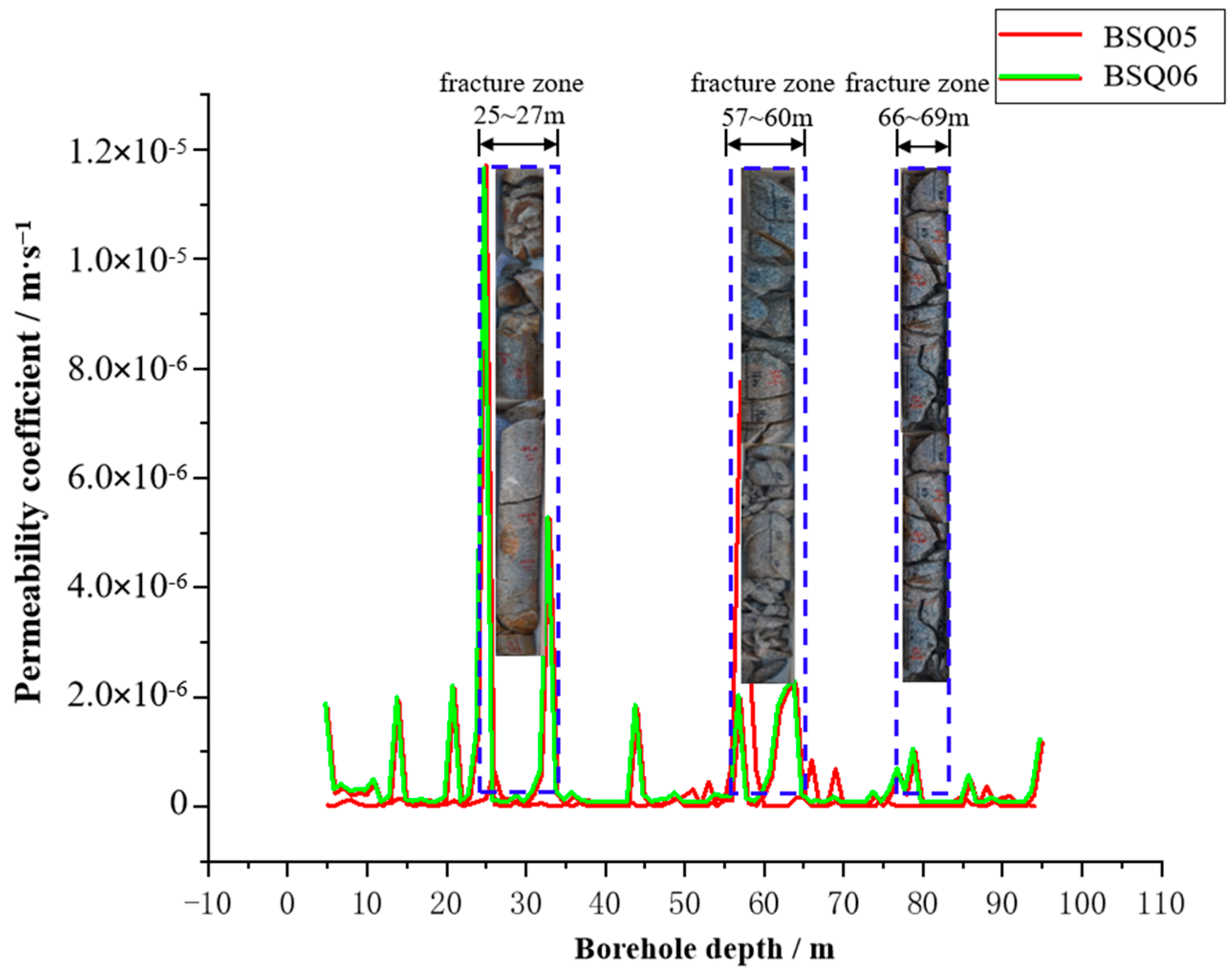 Comparison of permeability coefficients and cores of holes BSQ05 and BSQ06, the blue dotted line indicates zones where the permeability coefficient exhibits a sudden increase, corresponding to rock masses that are relatively fragmented and characterized by well-developed fractures.