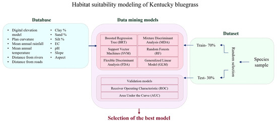 A binary approach was utilized in the modeling process, meaning that “0” indicated species absence and “1” indicated species presence. Seventy percent of the data were used for model training, consisting of 70% presence records (1) from the observed sites and an equal proportion of absence data (0). These two datasets were then merged and used in the modeling process. Each of the above-mentioned six models was applied to produce a map of Kentucky bluegrass SDM. The R program version 3.5.3 was used, together with several specialized packages, to execute each of the models. BRT (https://cran.r-project.org/package=gbm), FDA (https://cran.r-project.org/package=mda), MDA (https://cran.r-project.org/package=mda), GLM (https://stat.ethz.ch/R-manual/R-devel/library/stats/html/glm.html), RF (https://cran.r-project.org/package=randomForest), and SVM (https://cran.r-project.org/package=e1071) packages were utilized, and the models were run by R version 3.5.3 (https://cran-archive.r-project.org/bin/windows/base/old/3.5.3/; all URLs accessed on 7 November 2024).