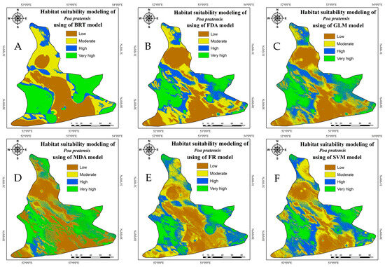 Maps of Kentucky bluegrass habitat suitability using different models: BRT (A), FDA (B), GLM (C), MDA (D), RF (E), and SVM (F).