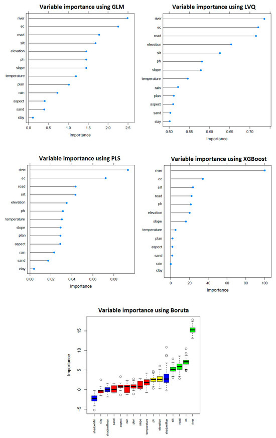 Importance of different factors using the GLM, LVQ, PLS, XGBoost, and Boruta models for Kentucky bluegrass (P. pratensis).