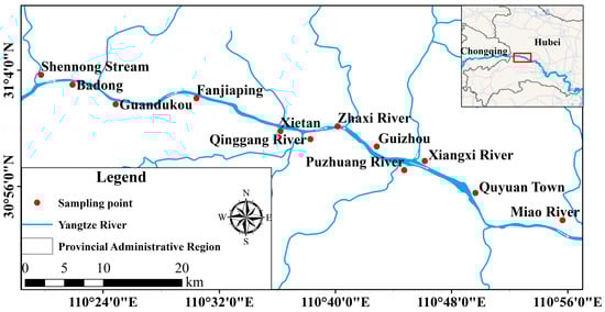 Field sampling for this investigation was conducted during autumn 2020, focused on the Yangtze mainstem and tributaries from Badong County to the Three Gorges Dam. Twelve monitoring stations were established at the following locations: Miao River (MR), Xiangxi River (XR), Zhaxi River (ZR), Quyuan Town (QT), Xietan (XT), Shennong Stream (SS), Puzhuang River (PR), Badong (BD), Fanjiaping (FP), Guandukou (GK), Guizhou (GZ), and Qinggang River (QR). The site configurations are detailed in Figure 1.