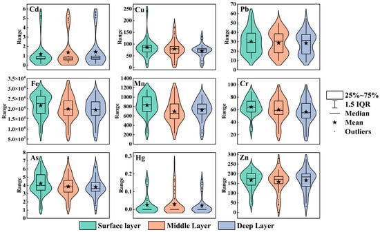 To characterize depth-dependent distribution patterns of nine heavy metals, sediment profiles (0–65 cm) were stratified into the following three horizons: surface (0–20 cm), intermediate (25–40 cm), and deep layers (45–65 cm) [57]. Concentration frequency distributions across strata were statistically analyzed and visualized via violin plots (Figure 2). Results revealed that mean concentrations of Cd and Hg substantially exceeded their interquartile ranges (IQR). Outliers (defined as >Q3 + 1.5IQR or <Q1 − 1.5IQR) constituted 13.9% and 17.5% of observations, respectively, exclusively above the IQR, exhibiting markedly right-skewness indicative of frequent extreme values from point-source pollution. Conversely, Pb, Fe, Mn, Cr, and As displayed quasi-normal distributions characterized by high congruence between medians and means, with outlier proportions <1%, reflecting stable diffusion governed by geological processes.