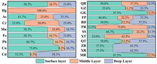 Vertical maximum-concentration frequencies quantified aggregation effects and historical contamination. As in Figure 3, Vertical profiling revealed the maxima occurred predominantly in surface sediments for Cu, Pb, Fe, Mn, and Zn, suggesting recent anthropogenic influence or inherent surface enrichment. Conversely, Cd exhibited maximal peak deep-layer accumulation frequency, suggesting historical contamination or downward migration via soluble complexation and porewater transport, demonstrating pronounced vertical accumulation effects, which were consistent with a recent study [58]. Spatially, MR and GK showed intense surface enrichment, signifying active contemporary inputs. XR and ZR exhibited marked deep-layer accumulation, potentially influenced by legacy pollution or deep groundwater infiltration. Given differential ecological risks and toxicological effects among contaminants, further investigation integrating source apportionment and ecological risk assessment is warranted.