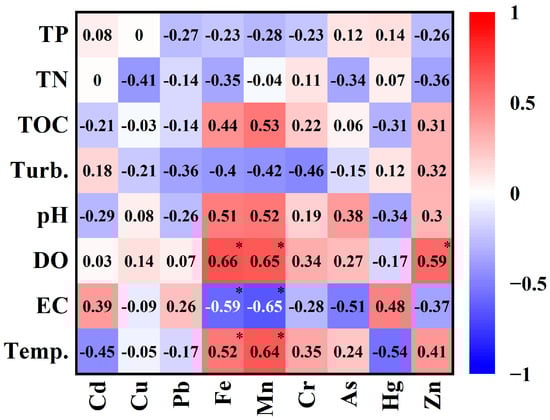 Correlation between sediment metals and water physicochemical properties. * indicate p < 0.05.