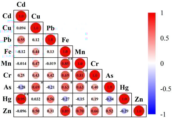 Inter-element correlation analysis of sediment heavy metals (Figure 5) revealed distinct source groups and coupled environmental behaviors. A robust positive correlation (r = 0.95) between Cd and Hg indicated high homology from anthropogenic sources such as industrial metallurgy or e-waste dismantling [59,61]. Strong geochemical paragenesis among Fe, Mn, Cr, and Zn reflected migration governed by coprecipitation with Fe-Mn oxides and surface adsorption, confirming dominant natural diagenetic contributions [62,63]. Significant Cu-As covariation suggested mining or industrial inputs. Notably, weak negative correlations between Cd/Hg and Fe/Mn pairs revealed antagonistic effects between anthropogenic contamination and natural geochemical processes. Minimal correlations among other elements demonstrated clear source differentiation without substantial cross-influence mechanisms.