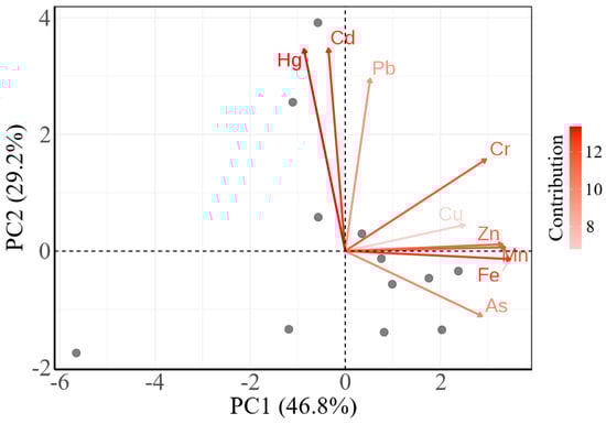 Principal Component Analysis (PCA) was employed to identify potential heavy metal sources in sediments [46], with loadings detailed in Table 9 and Figure 6. The suitability of the data for PCA was statistically validated. The Kaiser-Meyer-Olkin measure yielded a value of 0.708, indicating adequate sampling adequacy, and Bartlett’s test of sphericity was highly significant (p = 5.06 × 10−145), confirming sufficient correlation among variables. The analysis was performed on standardized data to account for scale differences. Two principal components (PC1 = 4.21, PC2 = 2.63) with eigenvalues >1 cumulatively explained 76% of variance (PC1 = 46.76%, PC2 = 29.24%), indicating robust source identification. Source apportionment revealed the following: PC1 was dominated by Fe (0.929), Mn (0.90), Zn (0.885), Cr (0.792), As (0.77), and Cu (0.672). The Fe/Mn loading ratio (1.03) approached natural sedimentary values, indicating control by Fe-Mn oxide coprecipitation—a signature process of natural weathering governed by geological backgrounds [62,63]. High As loading (0.77) suggested adsorption coupling with iron oxides. PC2 exhibited dominance by Cd (0.929), Hg (0.927), and Pb (0.791). The minimal Cd-Hg loading differential (0.002) confirmed homologous origins from anthropogenic sources like electronic industry emissions.