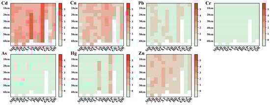 Statistical analysis of eight heavy metal concentrations in 0–65 cm sediment horizons across 12 sampling sites is presented in Table 8. The results indicate that Cd and Hg exhibit the most pronounced anthropogenic contamination. Cd concentrations ranged from 0.18 to 5.76 mg·kg−1, with a max-min ratio of 32.0 and coefficient of variation (CV) of 116.76%. Hg concentrations varied between 0 and 0.26 mg·kg−1, demonstrating the highest spatial heterogeneity (CV = 214.46%) across the study area, suggesting intensive point-source inputs. Significant spatial fluctuations were observed for Cu, Pb, and As, with CV values of 45.25% and 41.90%, respectively, indicating moderate anthropogenic perturbation. Fe, Cr, Mn, and Zn exhibited relative homogeneity (CV ≈ 30%), implying predominant natural origins. The mean Fe concentration (20,362.06 ± 5686.36 mg·kg−1) aligns with fluvial sediment geochemical backgrounds. Mn (751.60 ± 234.43 mg·kg−1) and Cr (60.49 ± 17.01 mg·kg−1) concentrations corresponded to regional sedimentary rock weathering baselines [56], showing no marked anthropogenic enrichment.
