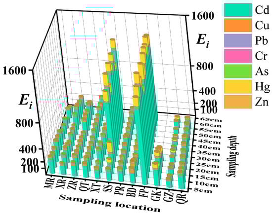The Risk Index (RI) quantifies the cumulative potential ecological risk of heavy metals, calculated as the sum of individual ecological risk factors (Formula (3)). Following Håkanson’s methodology [20], the cumulative toxicity coefficient for the eight target metals in this study was 93. Consequently, the threshold value for the low ecological risk category was determined to be 100 following rounding, with subsequent risk level threshold doubling relative to the preceding category incrementally. Corresponding Ei and RI values are presented in Table 5.