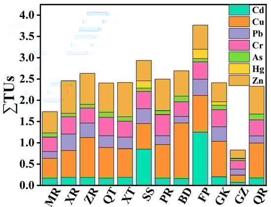 Comprehensive biological toxicity assessment through summation of ΣTUs (Figure 11) revealed values ranging from 0.83 to 3.76. All sites exhibited ΣTUs < 4, classified as uncontaminated. GZ (ΣTUs = 0.83) represented the cleanest site within the study area, with all elements <0.2 × TEL. Although FP reached the maximum ΣTUs (3.76), natural geochemical buffering prevented synergistic effects from exceeding critical thresholds, maintaining low biological toxicity. In summary, localized Cd and Cu exceedances in sediments induced no systemic toxic effects. However, specific ecological risks at FP and SS necessitate prioritized monitoring.