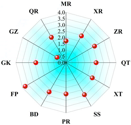 Sediment quality guidelines (SQGs) enable rapid identification of priority areas through potential acute toxicity assessment [50,51]. When contaminant concentrations are below Threshold Effect Level (TEL), they are considered unlikely to have adverse effects on sediment, and when concentrations exceed Probable Effect Level (PEL), adverse biological effects may occur frequently [52,53]. Concentration values that lie between the TEL and the PEL indicate that sediment organisms suffer from occasional adverse effects [52,53]. The PEL serves as the threshold for high-risk contamination requiring urgent remediation [54]. Corresponding TEL and PEL values are provided in Table 4. The sum of the toxic units (∑TUs) could be used to estimate the potential acute toxicity of the contaminants in a sample (Formula (4)), where TUs is the toxic unit for individual metals, Ci is the measured heavy-metal concentration, and PELi is the probable effect concentration. Heavy-metal toxicity classification criteria are detailed in Table 6.