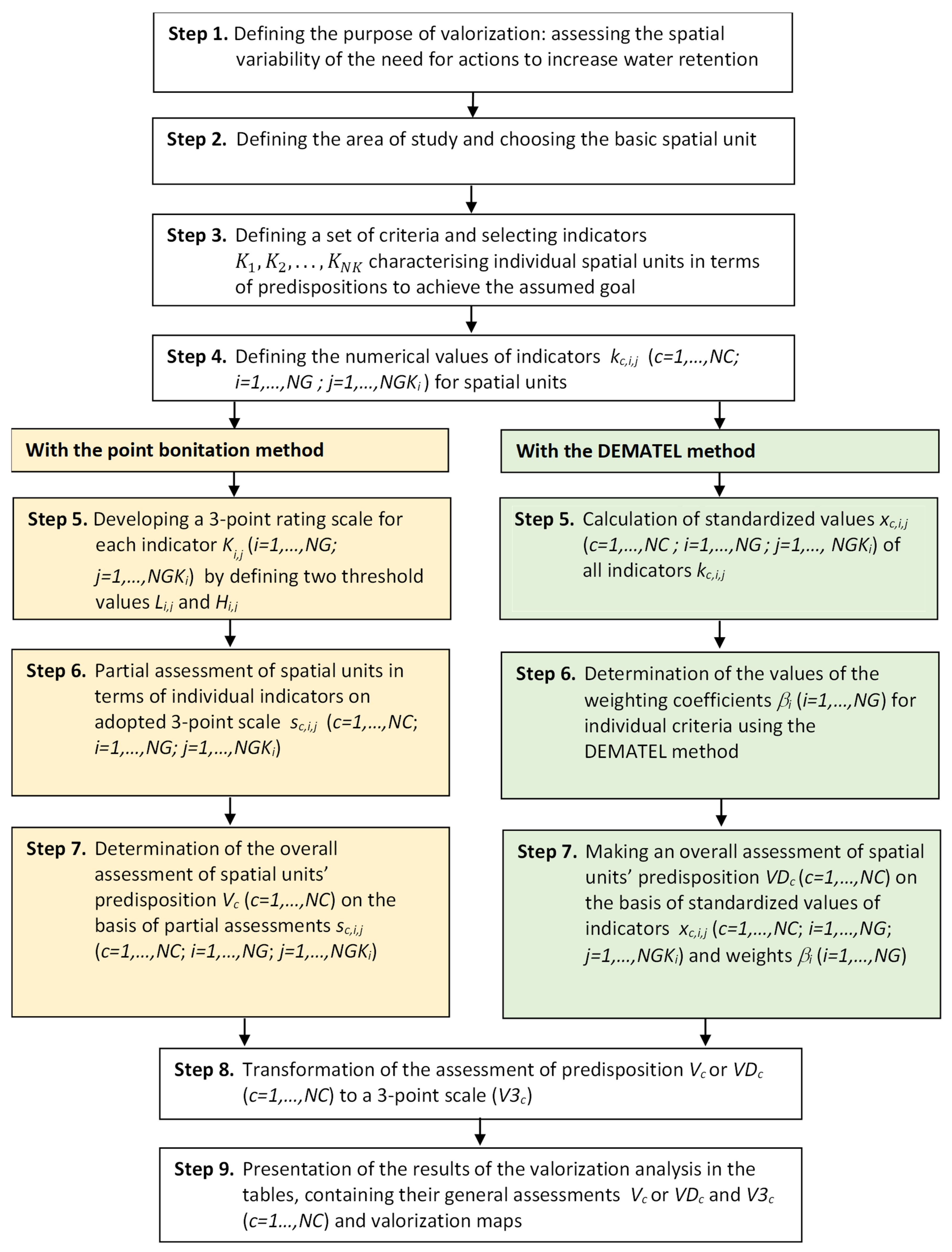 - Step 6. Assessment of spatial units in terms of indicators: the partial scores (sc,i,j) of the sub-catchment c in terms of the j-th indicator in the i-th criterion was calculated:By converting the values of individual indicators, kc,i,j, into scores, sz,i,j, following the assumptions of the point bonitation method, the scores of individual indicators can be treated as comparable.