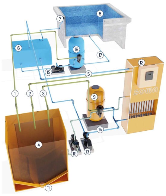 Scheme of the SOWA Wash Water Recovery System. 1. Rinse water from pool technology filters; 2. Rinse water from the ultrananofiltration system; 3. Rinse water from prefilter; 4. SOWA Rinse water tank; 5. Clean water for the swimming pool circuit; 6. Overflow tank; 7. Overflow gutter; 8. Swimming pool; 9. SOWA Prefilter; 10. SOWA Circulation pump; 11. SOWA Drain to sewage; 12. SOWA Nanoultrafiltration system; 13. SOWA Rinse pump; 14. Rinse water from the overflow tank; 15. Pool technology circulation pump; 16. Swimming pool filter; 17. Clean water for the swimming pool circuit.
