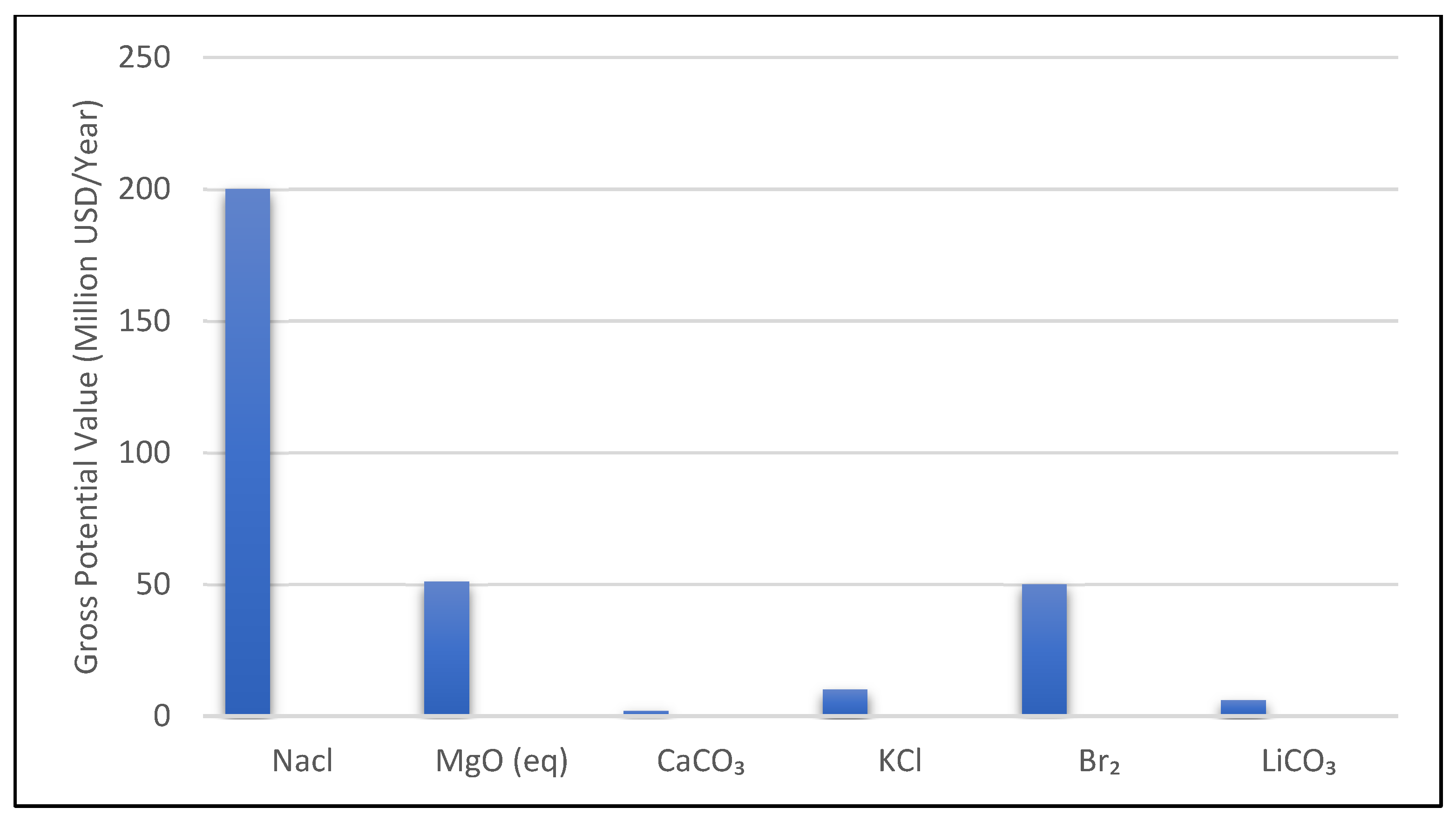 - del Villar, A.; Melgarejo, J.; García-López, M.; Fernández-Aracil, P.; Montano, B. The economic value of the extracted elements from brine concentrates of Spanish desalination plants. Desalination 2023, 560, 116678. [Google Scholar] [CrossRef]