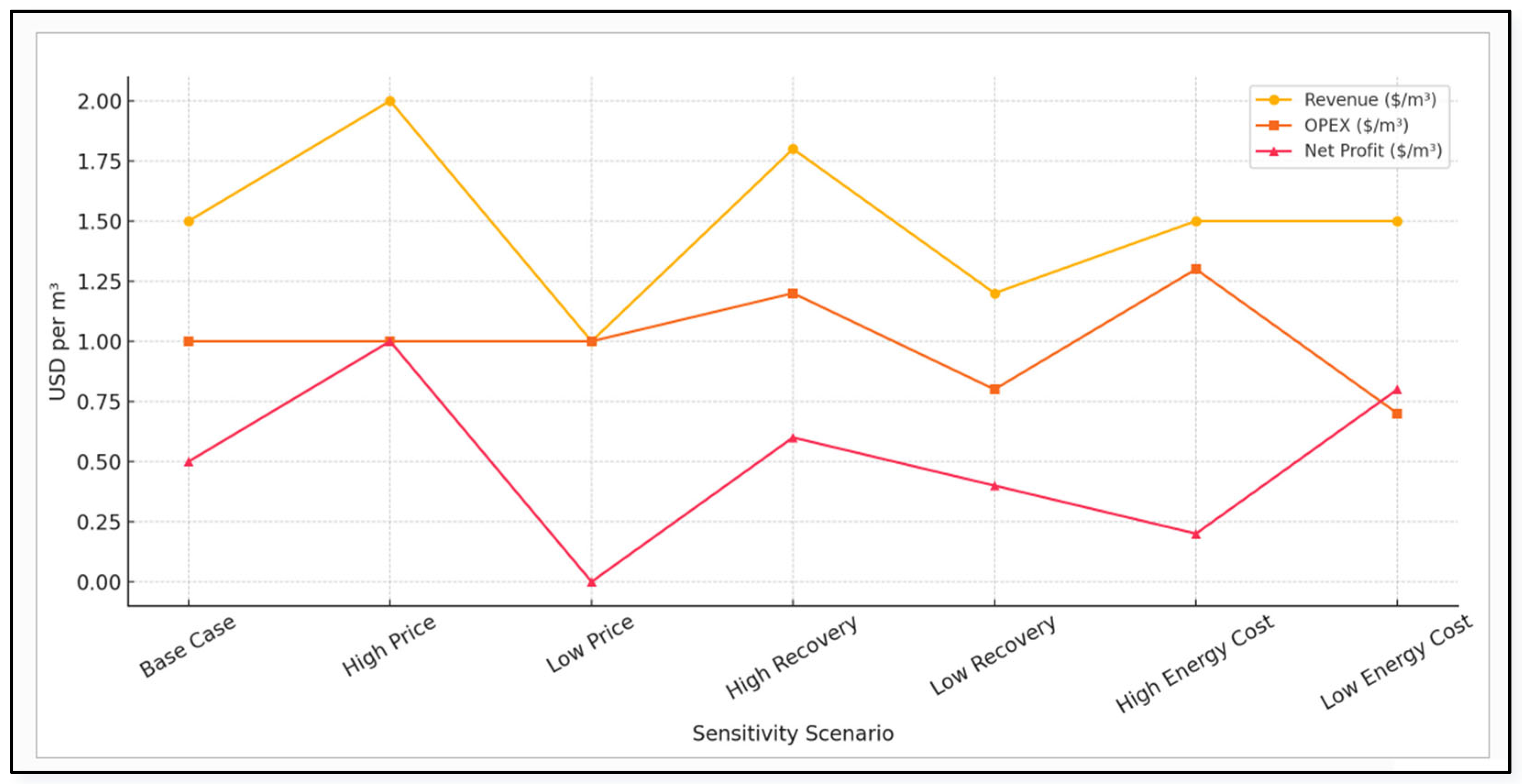 3.2.1. Simulated Economic Outputs for Brine Recovery
