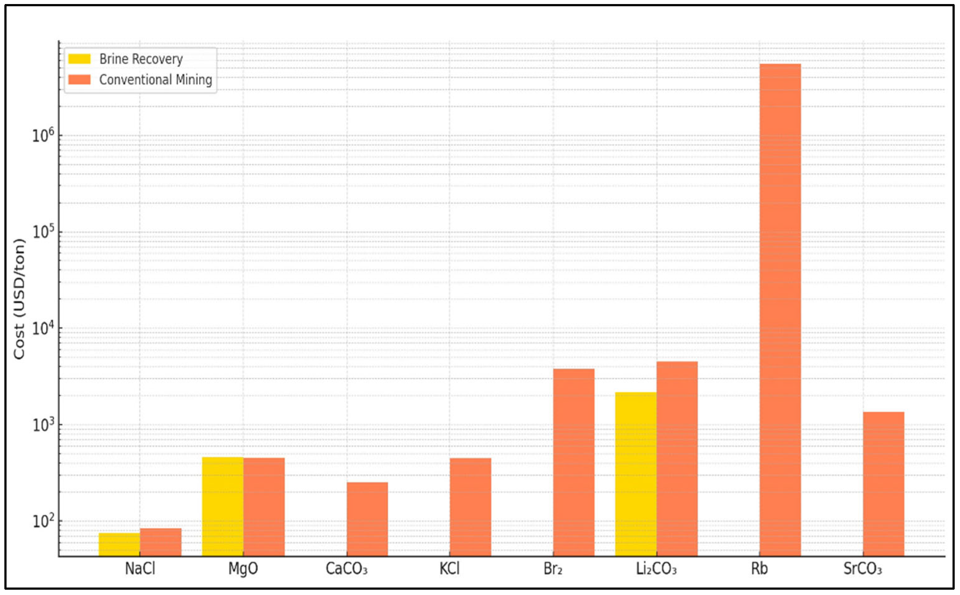 3.9. Cost Comparison: Brine Recovery Against Conventional Mining