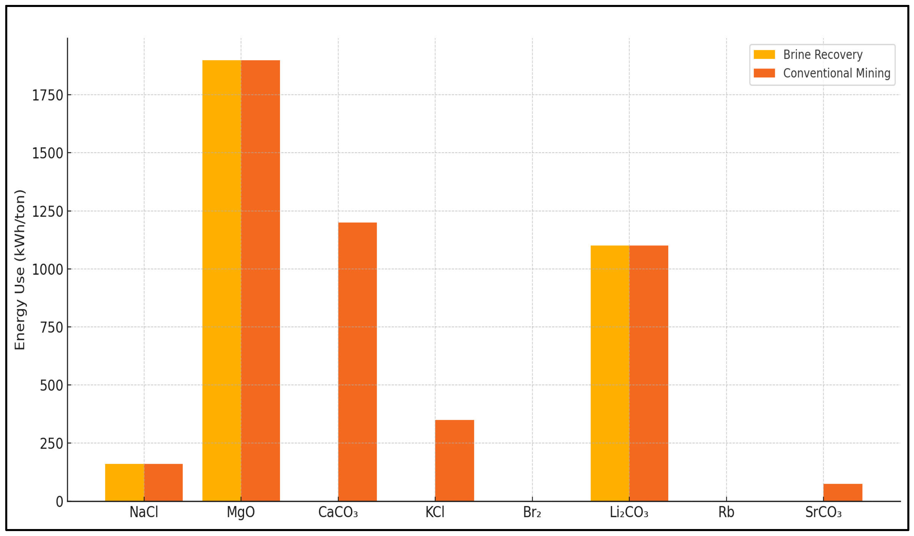 8 | Energy for brine processing (added) | 2.0 kWh/mÂ3 | Incremental energy for recovery | [33,34] |