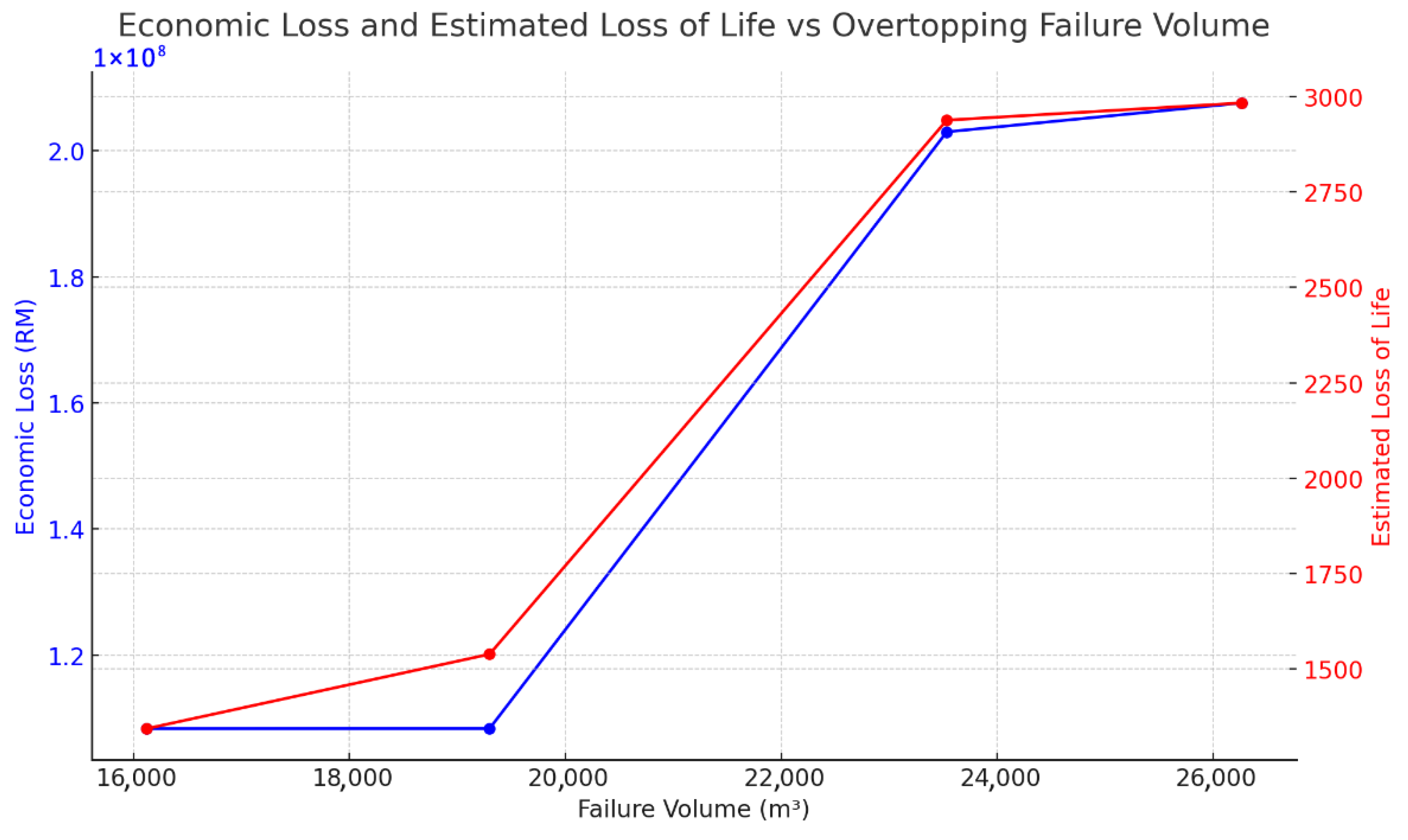 Figure 8, the relationship between failure volumes and their associated impacts, including estimated economic losses (in RM) and the number of lives lost, underscores the catastrophic consequences of overtopping. Beyond a failure volume of 20,000 m