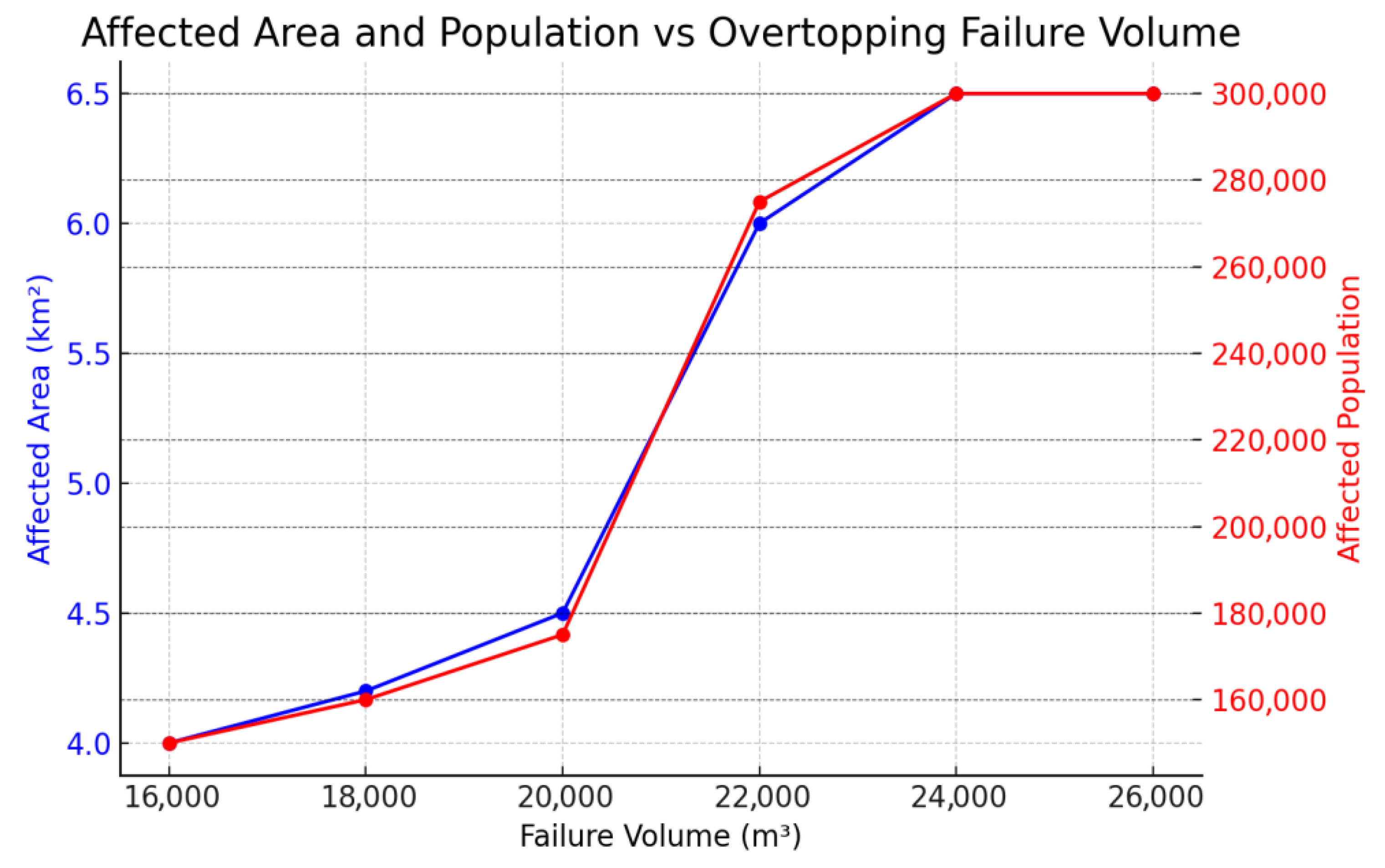 2, while the impacted population surpasses 300,000 individuals. This demonstrates the extensive downstream repercussions of dam failure and highlights the necessity for robust emergency planning to protect both lives and livelihoods in the event of overtopping.